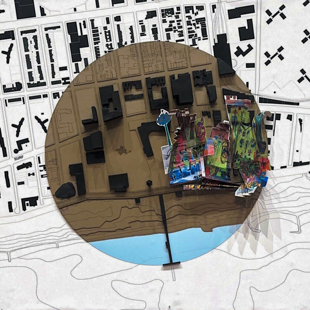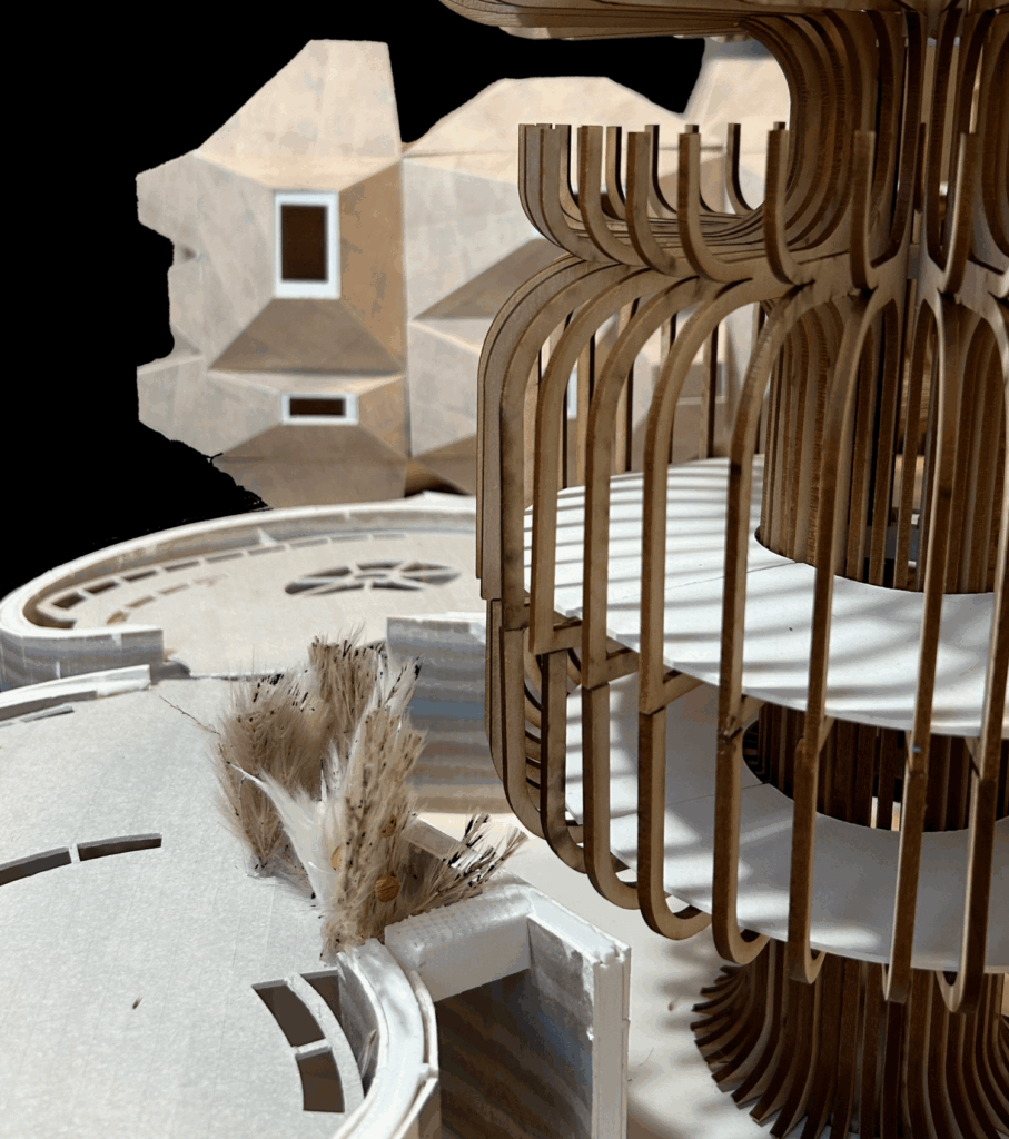 This midterm concept model illustrates the project’s core trade-off: ultra-compact sleeping pods clustered around generous shared amenities (bath, kitchen, recreation, study). It shows how pods bridge into larger volumes, how the circulation spine organizes public vs. private, and how the building lifts to create an open public ground with mostly open-air routes.