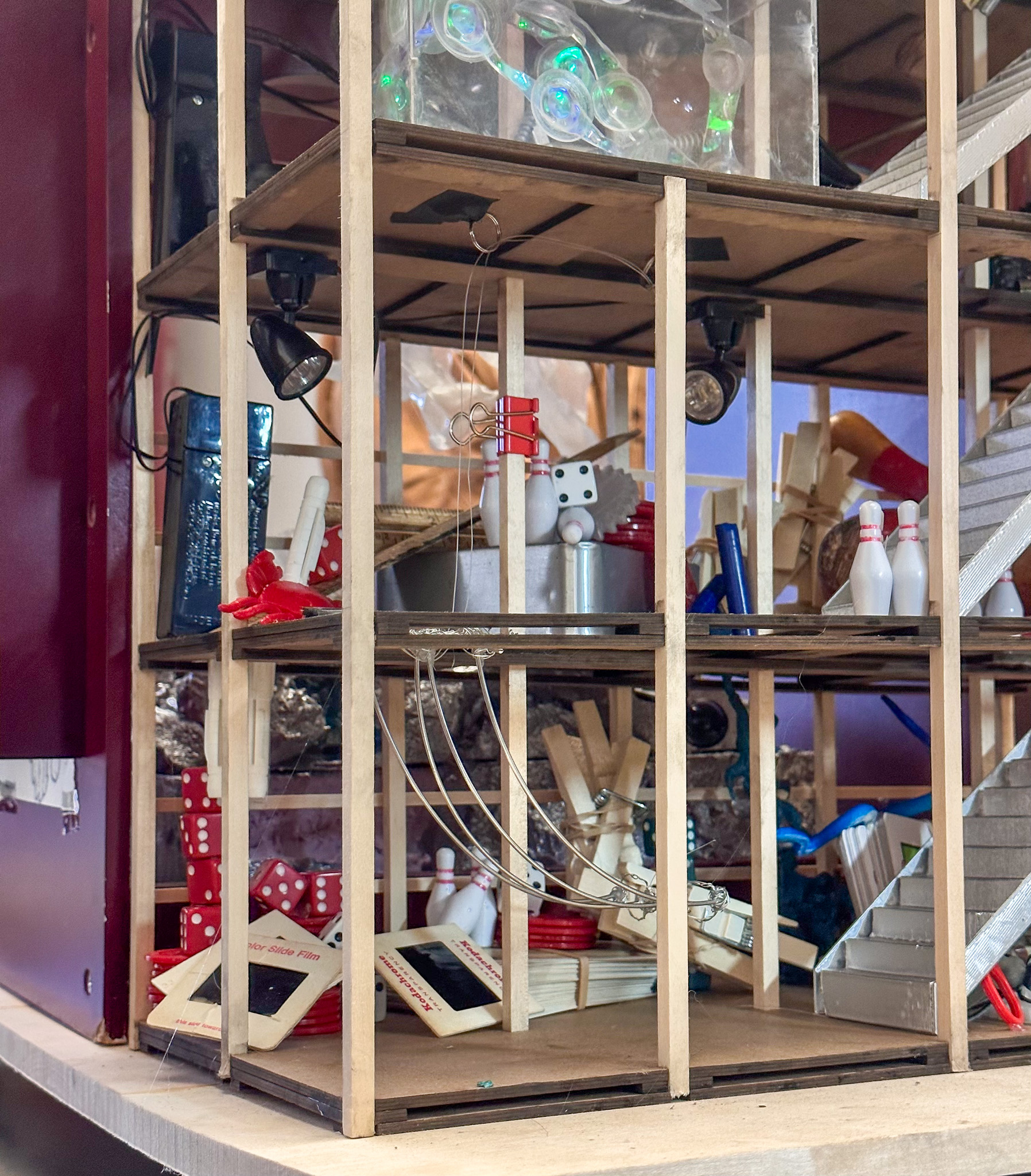 3D printed, chipboard, plywood, juggling club, metal rod, spray paint, fabric, string, etc, etc