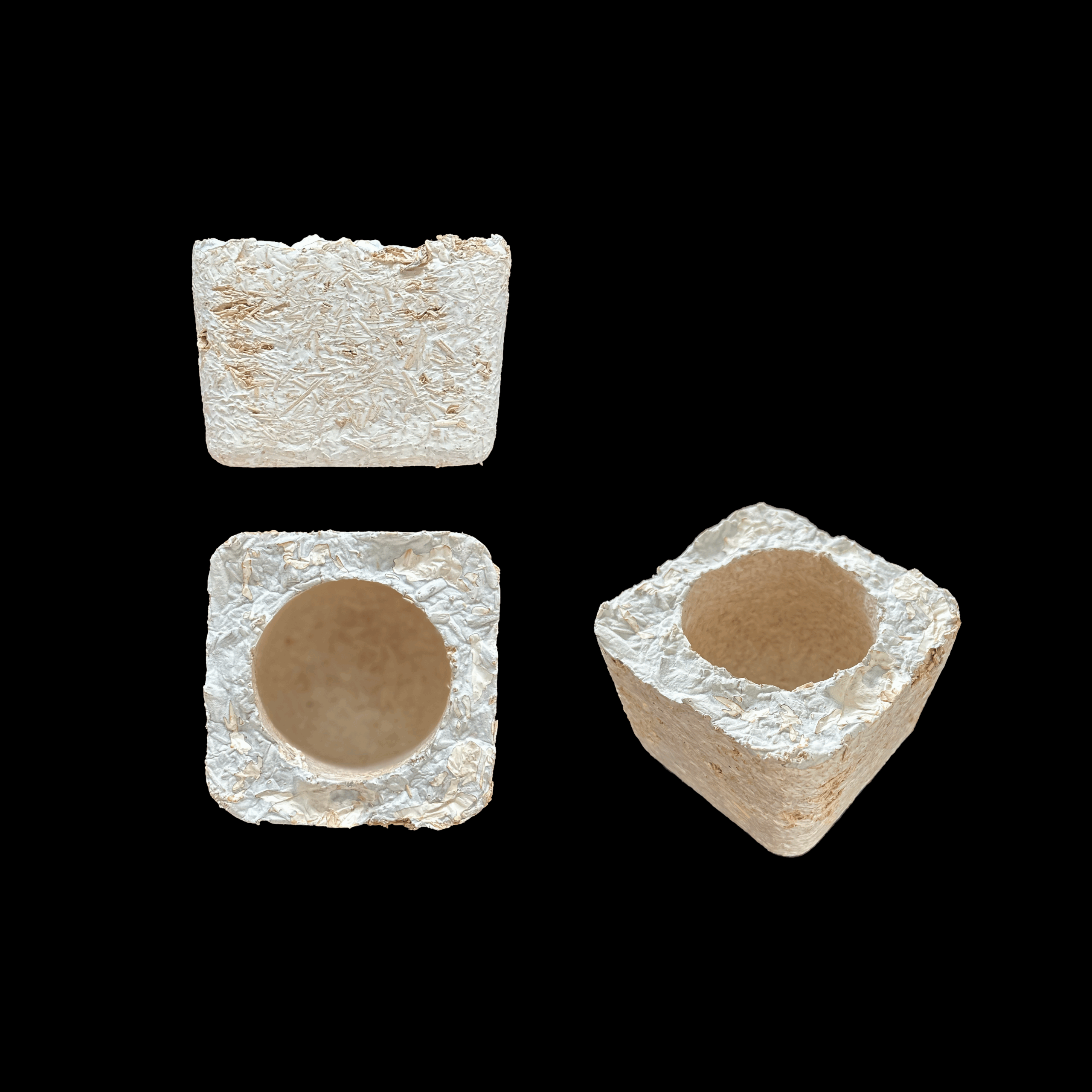 Biocomposite vessels formed by mixing a plant-fiber substrate with mycelium, pressing it into simple molds, and allowing the network to grow and bind the form. After curing, the pieces are heat-treated (“baked”) to stop growth, then dried to a lightweight, rigid finish. The result explores low-impact making—biodegradable, compostable objects grown rather than manufactured.